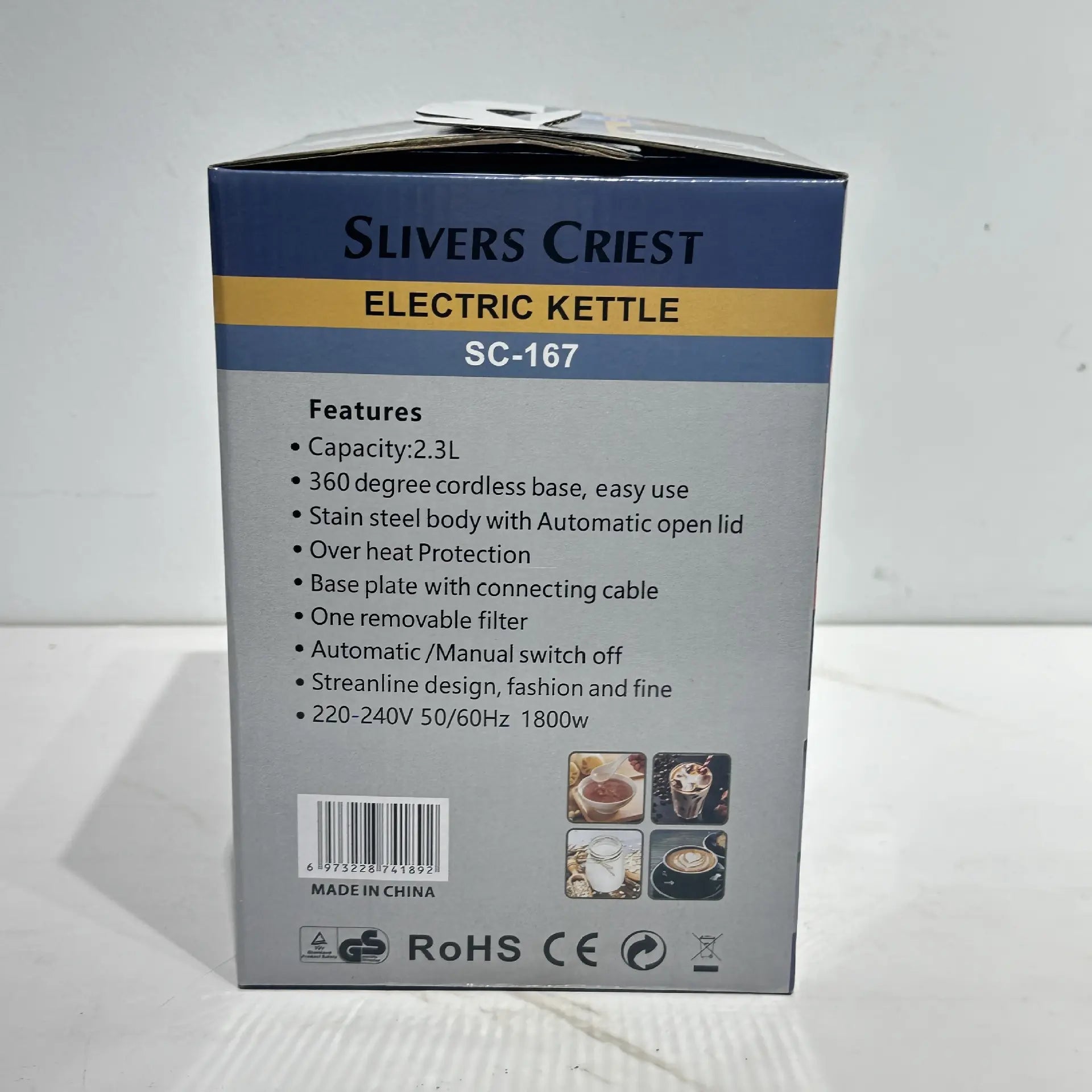 The Electric Kettle has been designed for your convenience and safety. The electric kettle has a 2.3 Litre capacity plus other amazing features such as an automatic shutdown, and water level indicator which lets you adjust the amount of water placed in the teapot. Automatically shuts off, once water reaches its boiling point. Made from rust-free, Food-Grade Stainless Steel. The ergonomically designed spout allows you to pour out contents with ease without creating drips.