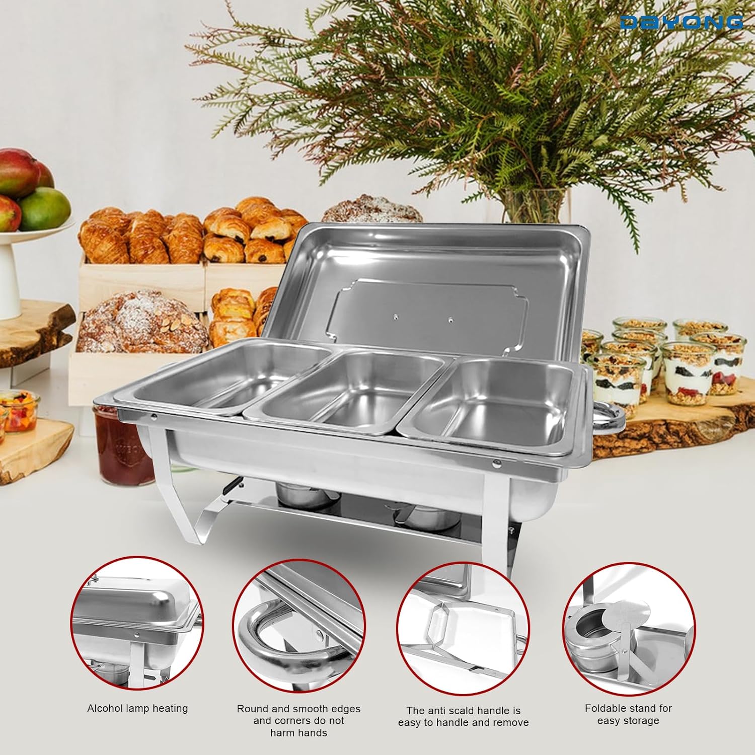 【Durable and Sturdy】The buffet stove is made of high-quality thickened stainless steel material, durable, rust proof and corrosion-resistant. Featuring fast thermal conductivity and continuous insulation, long-term use does not deform, providing you with an excellent dining experience.